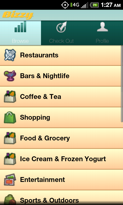 The second difference was just recently introduced. As of yesterday, Bizzy updated their apps to include a "Check Out" feature. Similar to FourSquare and Facebook Places, the Check Out feature allows you to post about your location. But instead of just broadcasting "Hey, I'm here" to your friends and stalkers, you're saying "Hey, I just left here, and this is how it was". You can pick one of 3 emoticons (Love It, Meh, and No Thx), and even include a short blurb should you so desire. This allows you to rate where you've been while it's fresh in your mind, and lets Bizzy get a better idea of what you like.